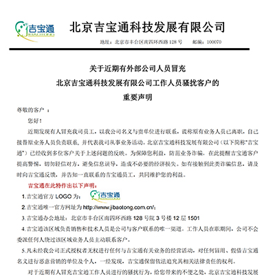 關(guān)于近期有外部公司人員冒充北京吉寶通科技發(fā)展有限公司工作人員