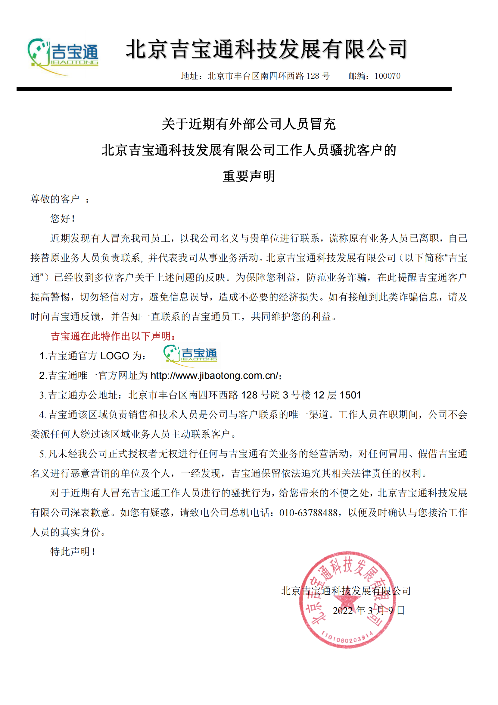 關(guān)于近期有外部公司人員冒充北京吉寶通科技發(fā)展有限公司工作人員